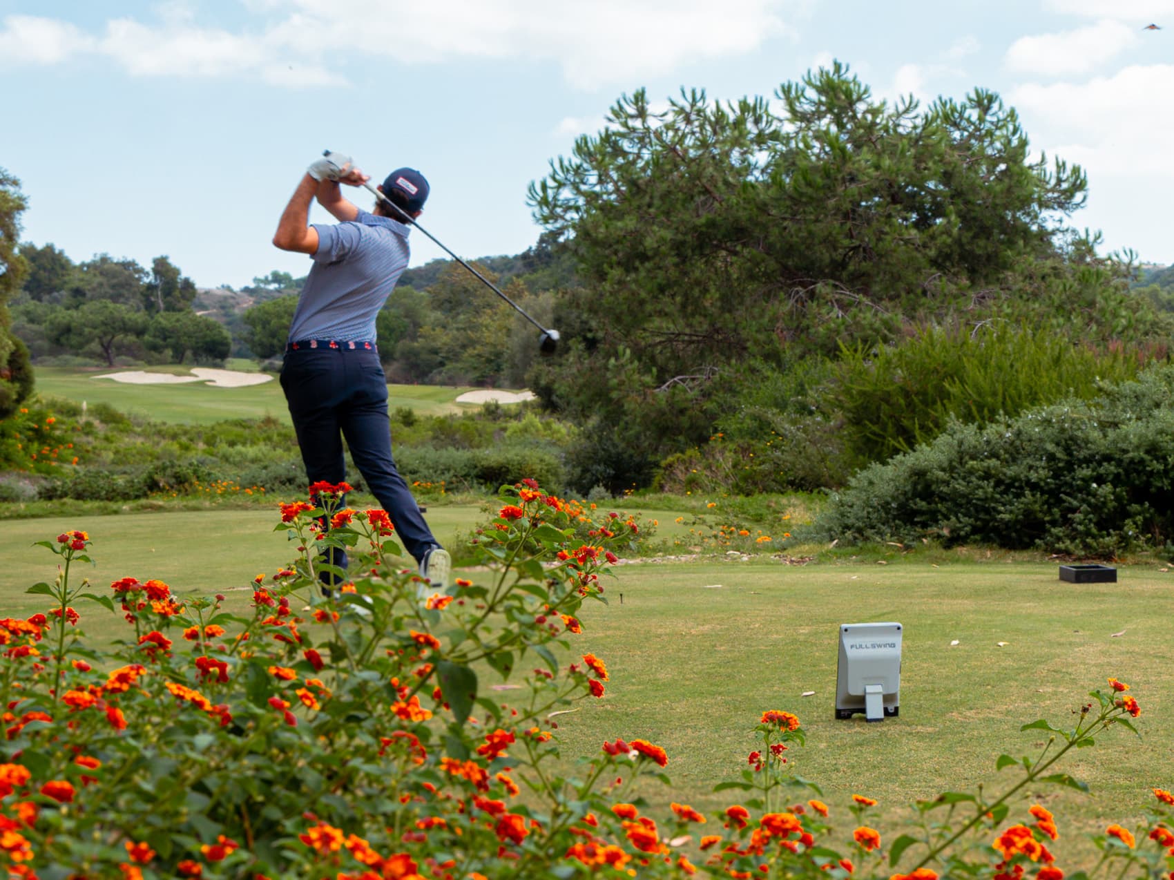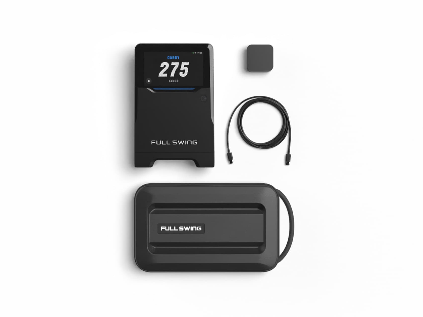 No extra accessories fees here, it’s all included: Full Swing KIT Launch Monitor, Charging Block, USB-C Charging Cable, Protective Travel Case